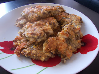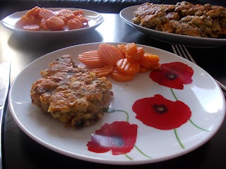 Cebulę oraz pieczarki ścieram na tarce o grubych oczkach. Smażę na rozgrzanym oleju. Solę. Pierś z kurczaka kroimy w kostkę. Ser ścieram na tarce o grubych oczkach. W misce mieszam kurczaka, ostudzone pieczarki, ser żółty, jajka, mąkę, sól i pieprz. Na rozgrzanej patelni nakładam łyżką placuszki i spłaszczam je. Smażę na złoty kolor z obu stron. Ja podałam z marchewką duszoną na maśle.