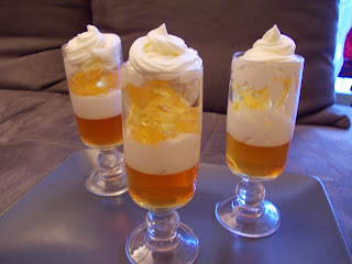 Jedną galaretkę pomarańczową przygotowuje według przepisu na opakowaniu. Wlewam po równo do pucharków. Wkładam do lodówki i czekam, aż galaretka stężeje . W międzyczasie przygotowuje drugą galaretkę i przelewam do lekko wypukłego naczynia (tak, aby można było pokroić powstałą galaretkę w kostkę)