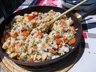 Ryż gotuję w osolonej wodzie. W tym czasie filet kroję w kostkę, smażę na odrobinie oleju. Podaję pokrojone z plasterki pieczarki. Warzywa przesmażam na patelni. Gdy będą miękkie, dodaję mięso, pieczarki, a następnie łączę z ryżem. Przesmażam razem, doprawiam do smaku...i podaję:)