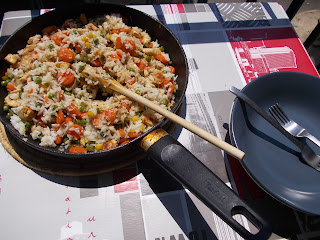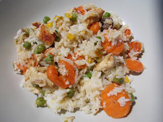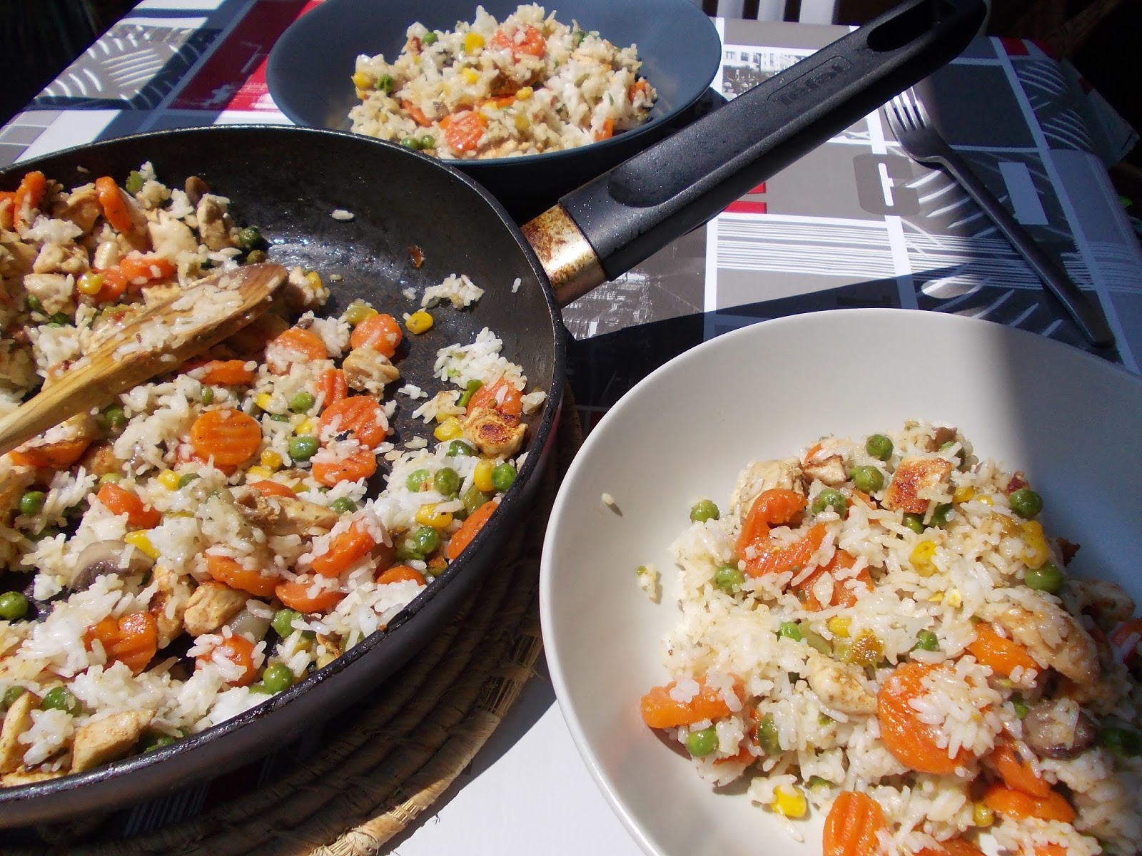 Ryż gotuję w osolonej wodzie. W tym czasie filet kroję w kostkę, smażę na odrobinie oleju. Podaję pokrojone z plasterki pieczarki. Warzywa przesmażam na patelni. Gdy będą miękkie, dodaję mięso, pieczarki, a następnie łączę z ryżem. Przesmażam razem, doprawiam do smaku...i podaję:)