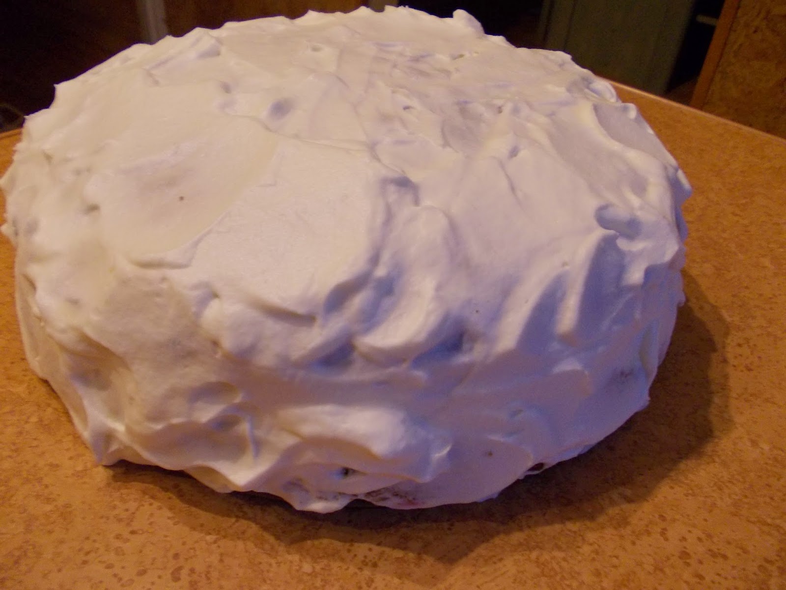 Krem (na zewnątrz): Kremówkę z dwoma łyżkami cukru pudru ubijam na sztywno. Łyżką delikatnie rozprowadzam na torcie.