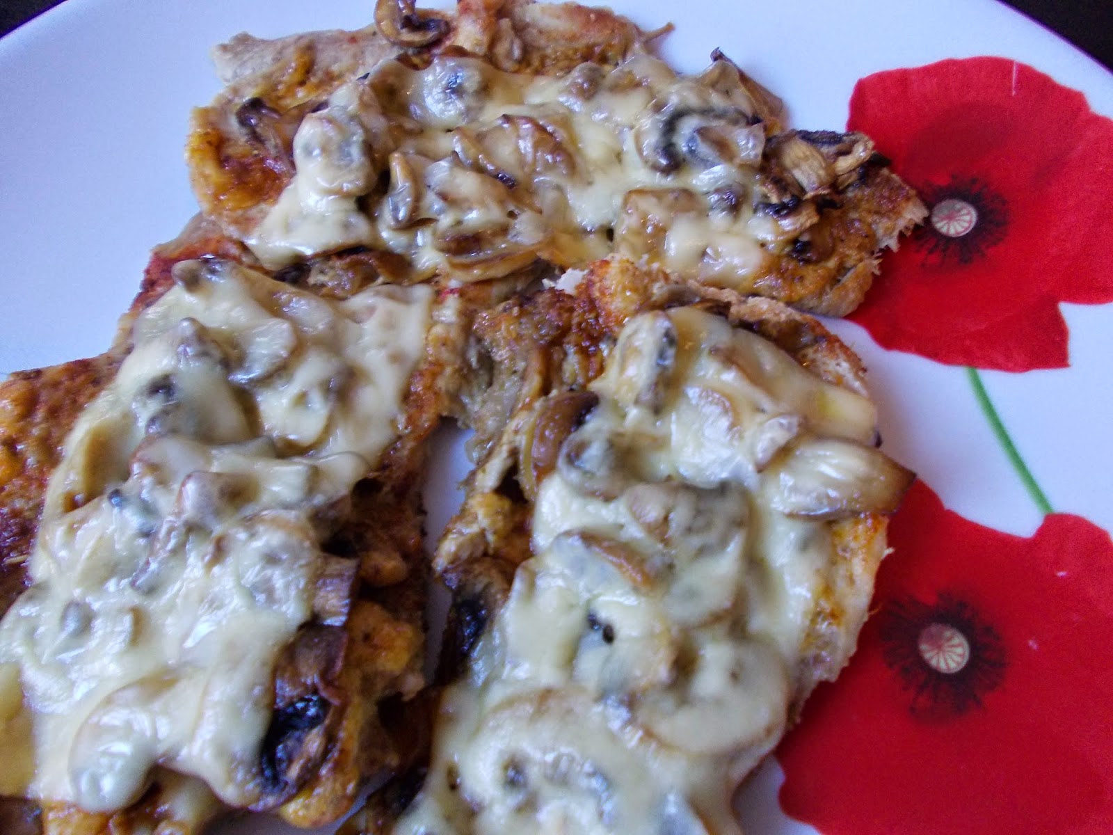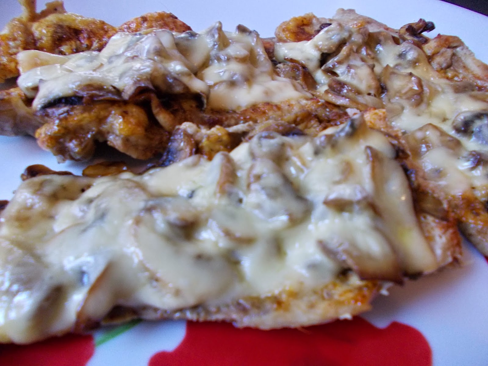 Plastry rozbijam, przyprawiam. Następnie smaruje każdy łyżeczką majonezu. Pieczarki kroję w plasterki i podsmażam na odrobinie oleju. Układam na mięsie pieczarki, następnie plastry sera. Zapiekam w piekarniku nagrzanym do 180 stopni przez 45minut.