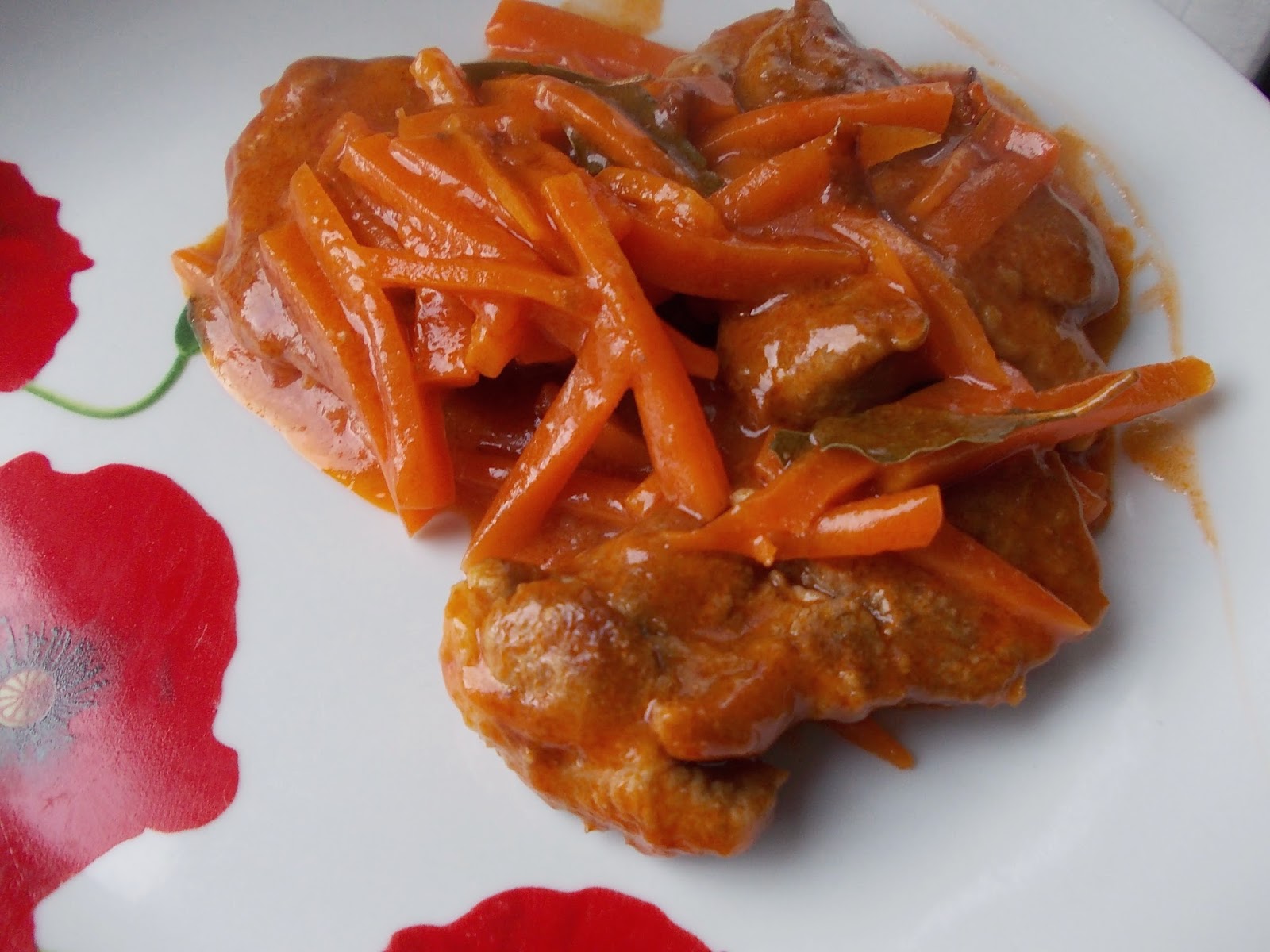 Schab kroję na około 2 cm plastry, które rozbijam. Przyprawiam z obu stron i obtaczam w mące. Następnie smażę na rozgrzanym oleju. Następnie zalewam wodą i duszę do miękkości- około 30minut. W międzyczasie marchewkę obieram i kroję w cienkie pasy i dorzucam do sosu (podczas gotowania się w sosie marchewka zmięknie). Sos doprawiam solą, a także dorzucam liście laurowe oraz ziarenka ziela angielskiego. Na koniec dodaje ketchup. Gotowe:)