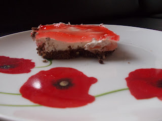 Ser mielę dokładnie (można użyć też sera z wiaderka). Śmietankę ubijam na sztywno z cukrem pudrem. Zmniejszam obroty miksera i łączę z serkiem mascarpone. Na końcu łączę ze zmielonym serem. Wykładam na spód i to jest nasza środkowa warstwa. Gdy galaretka zaczyna lekko tężeć, wylewam na ciasto i wkładam do lodówki na całą noc.