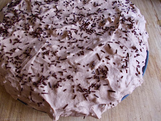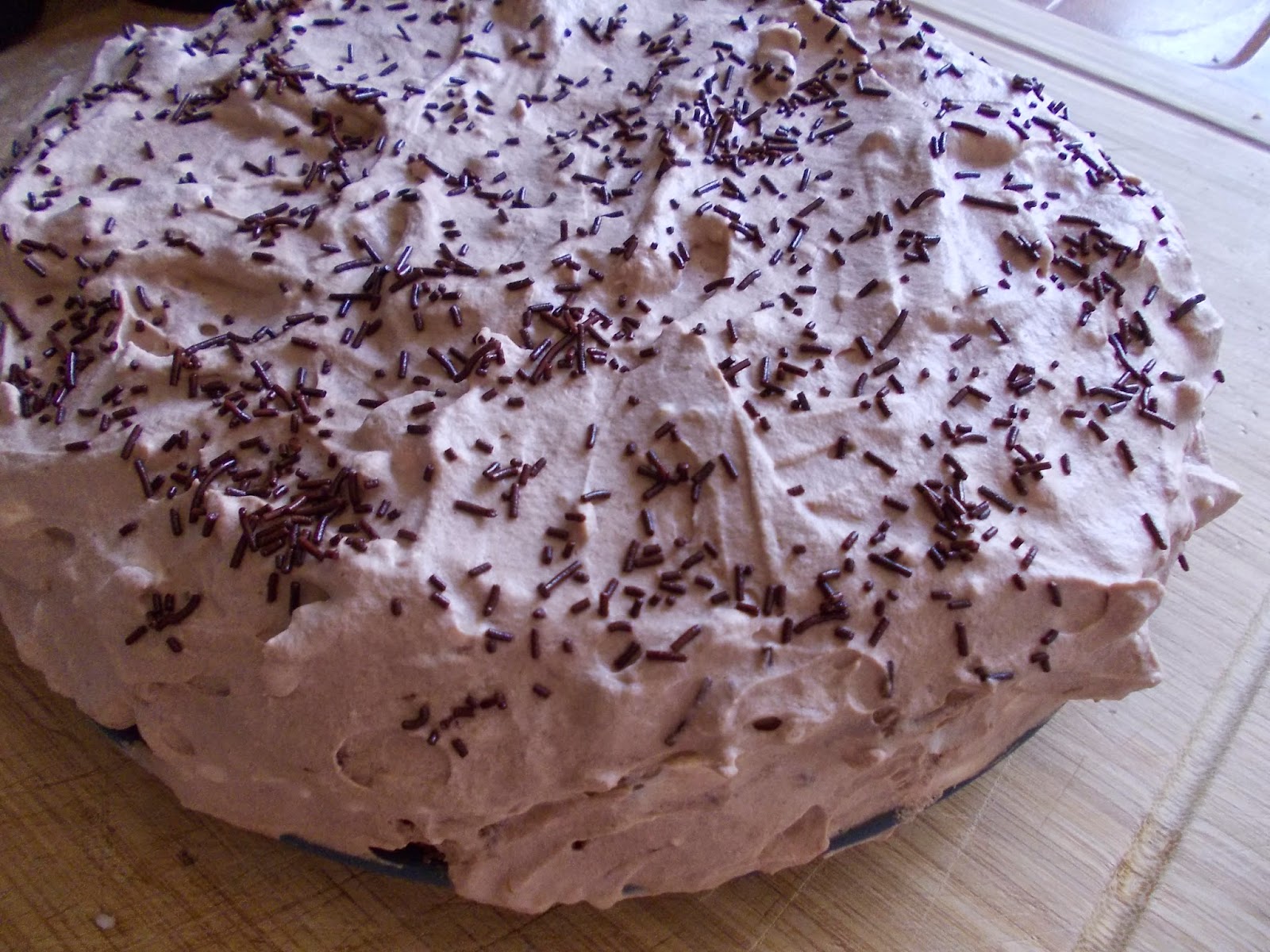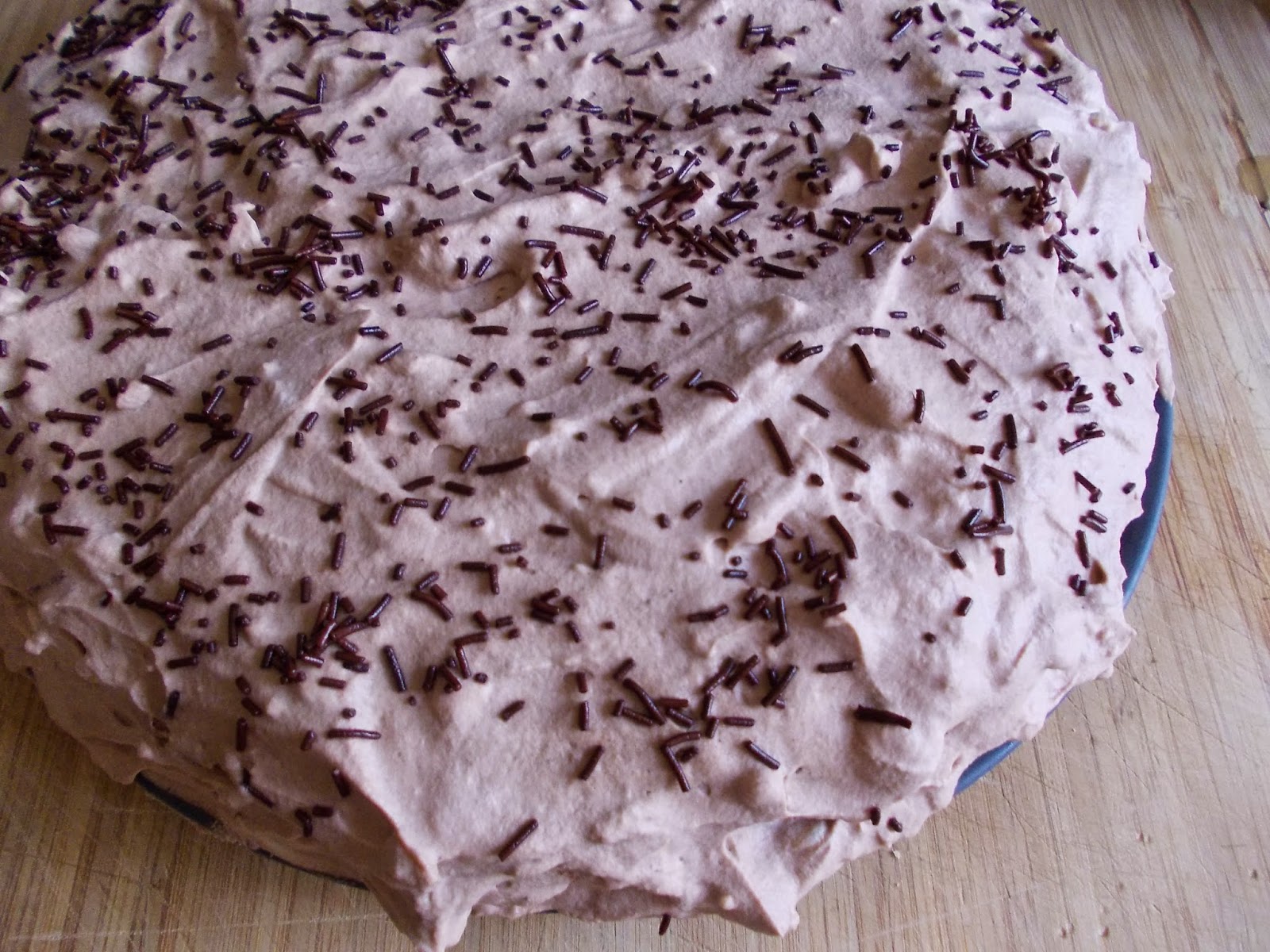 Krem: Śmietanę razem z cukrem pudrem ubijam na sztywno. Dodaje po łyżce serek mascarpone. Ubijam na mniejszych już obrotach na puszystą masę. Większą część odkładam na krem, a część zostawiam, dodaje do masy łyżkę kakao- tym dekoruje tort:)
