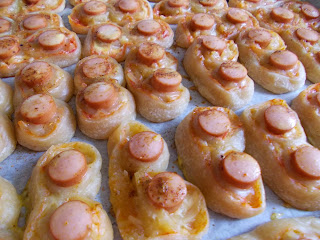 Ciasto wraz z parówkami zawijam do środka z dwóch boków- przypomina to złożony zwój papieru, papirusu...