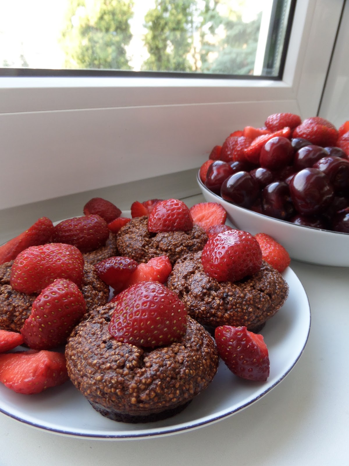 kakaowo-waniliowe babeczki amarantusowe z truskawkami; truskawki i czereśnie |