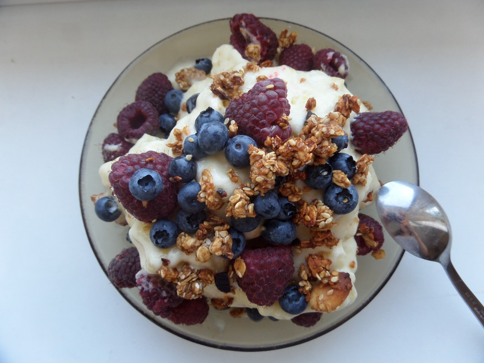 lody ananas-banan z malinami, borówkami i domową granolą |