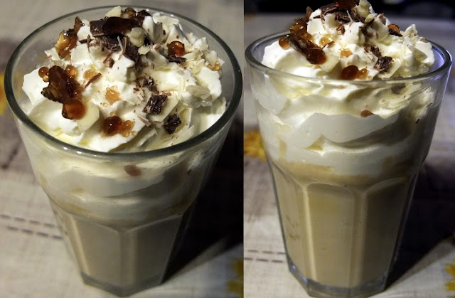Dekorujemy bitą śmietaną, sosem karmelowym, czekoladą i kawiorem z kawy.