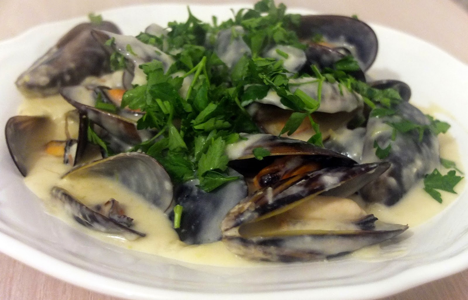 Na talerz wykładamy mule, polewamy obficie sosem i posypujemy natką pietruszki.