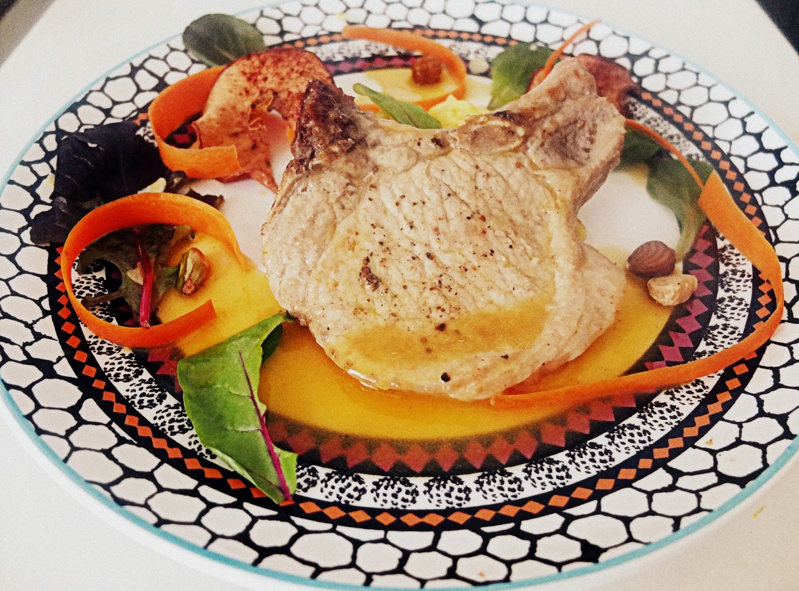 Od jakiegoś czasu w moim menu znalazł się schab z kością. Zazwyczaj robiłem go w tradycyjny sposób czyli w jajku i bułce ziemniakami. Ale po pewnym czasie takie połączenie zaczyna się zwyczajnie nudzić. Zacząłem eksperymentować i włączyłem go trochę już w świąteczny nastrój. Sam zapach schabu z goździkami, kolendrą i sosem pomarańczowym odrazu przypomina o świątecznym nastroju :) Składniki:- 4 plastry schabu z kością