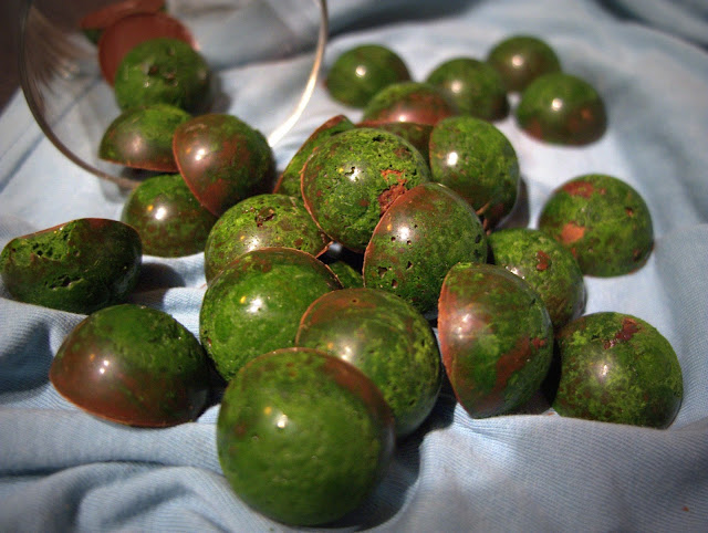Przygotowanie: Czekoladę gorzką i mleczną rozpuszczamy w kąpieli wodnej do temperatury 45 stopni (tzn umieszczamy czekoladę w misce metalowej i stawiamy na garnku z gotującą się wodą). Następnie schładzamy czekoladę do temperatury 35 stopni i dodajemy mycryo cacao butter (składnik ten spowoduje, że czekolada będzie się szybciej krystalizować, ale można go pominąć).