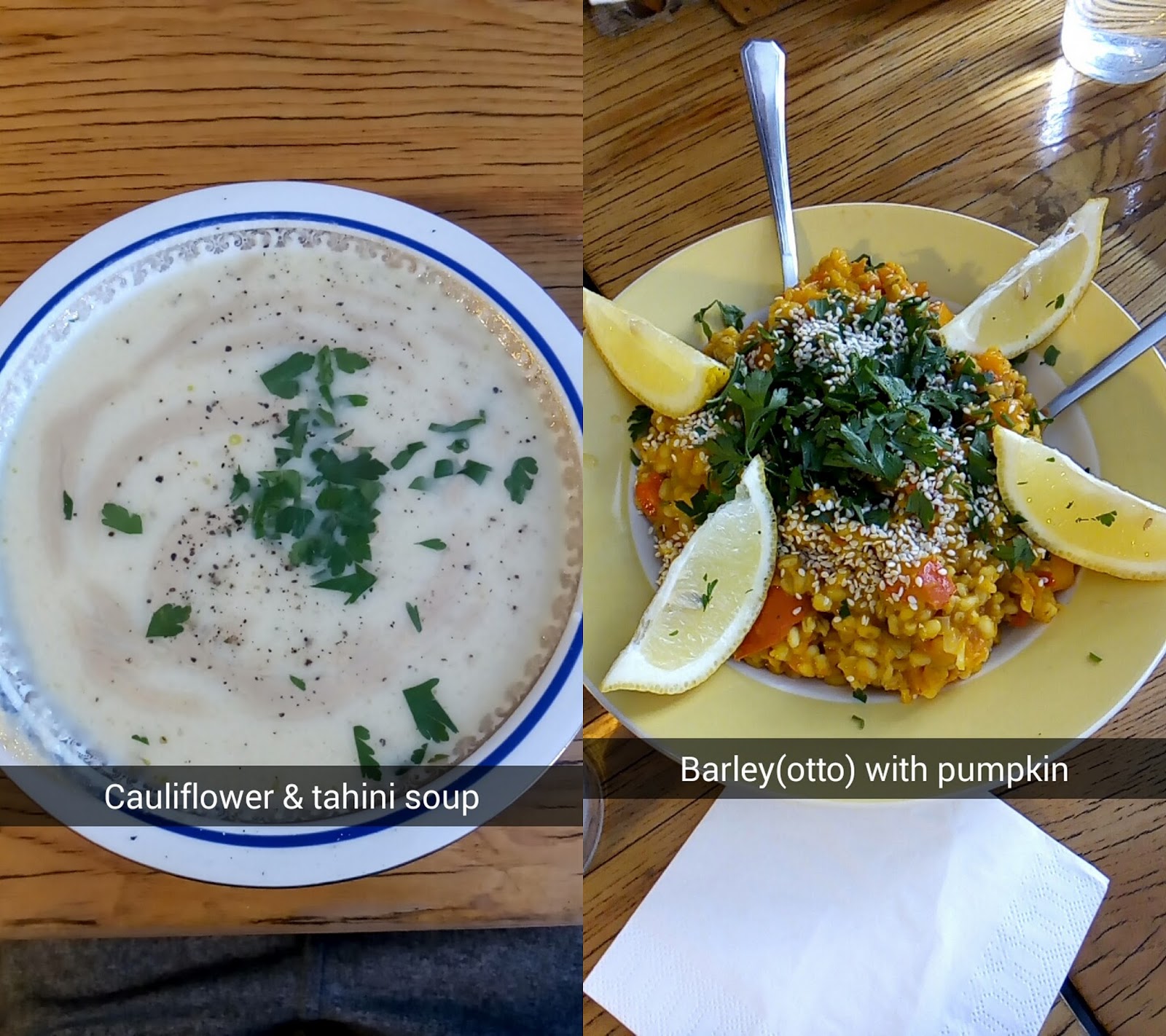 zupa krem z kalafiora z tahini i dyniowe pęczotto, oba z nutą zastrzeżeń