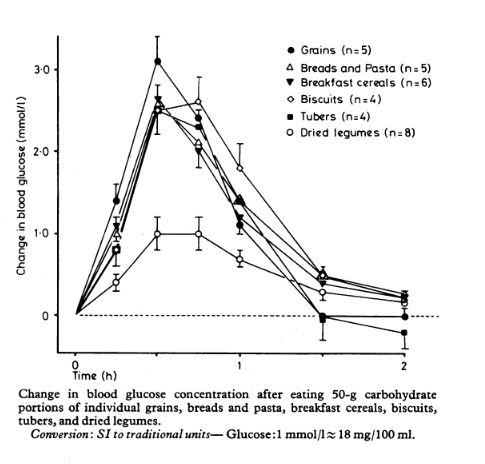 co najmniej połowę mniejszym wzrostem stężenia glukozy we krwi, jak i potem stabilnym i powolnym spadkiem, w porównaniu do innych produktów węglowodanowych. Rok później zespół wybitnego dr Davida Jenkinsa opracował