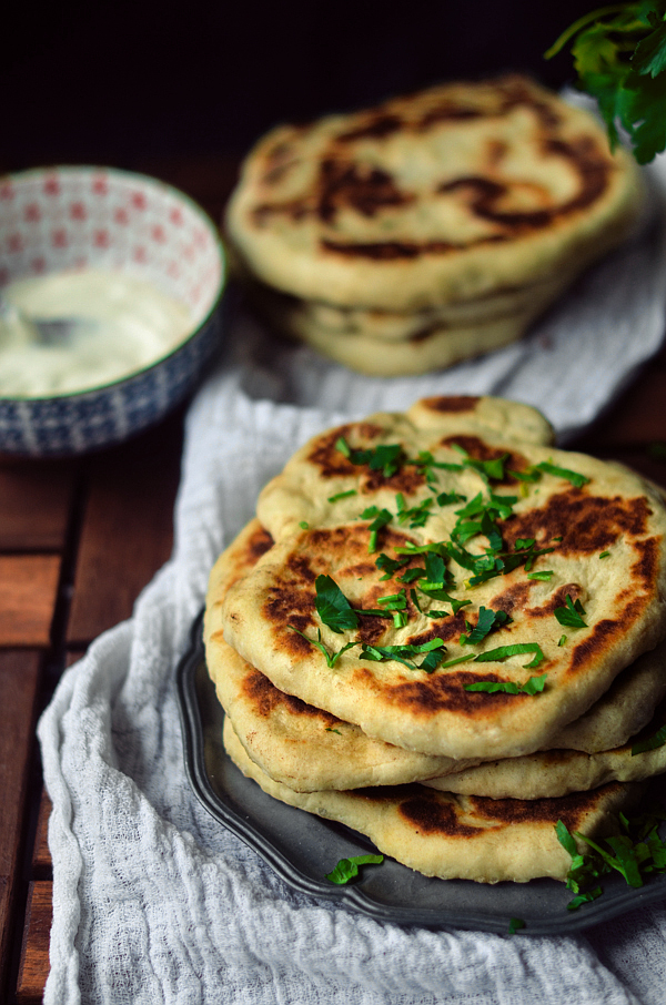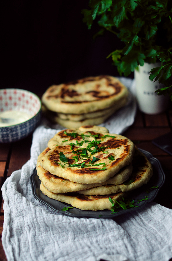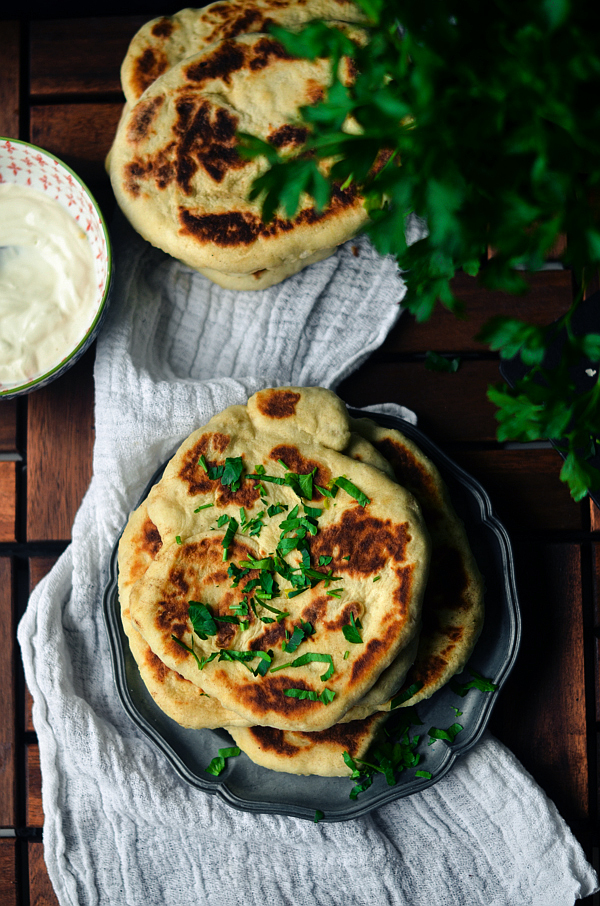 * wiem, że dodawanie sody i proszku do pieczenia w przepisach z drożdżami może wydawać się dziwne, ale zgodnie z obietnicami autorki przepisu ma to pomóc w lepszej strukturze ciasta. Chlebki są bardziej miękkie, puszyste i dłużej utrzymują świeżość. Są to również tradycyjne składniki w klasycznych przepisach na naan.