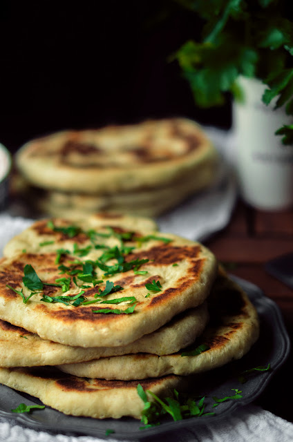 Nie wiem dlaczego, tyle czasu wzbraniałam się ze zrobieniem domowych chlebków naan. Nie kupowałam też w sklepie, po prostu ich nie jadłam. Zadaję sobie to pytanie, ponieważ chlebki naan to jedno z najlepszych dobroci, jakie moglibyśmy sobie wyobrazić. Są bardzo proste w przygotowaniu i smakują świetnie z curry, dipami, hummusem... można wymieniać bez końca. Odkąd zrobiłam je jakieś pół roku temu po raz pierwszy, regularnie pojawiają się w mojej kuchni. Koniecznie spróbujcie wersji domowej i ugotujcie jakieś dobre, rozgrzewające curry, których na blogu zresztą nie brakuję. Możecie też chwilę poczekać, ponieważ na blogu zapowiada się bardzo smaczny przepis kuchni indyjskiej:) Będziecie zachwyceni, mówię Wam!