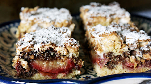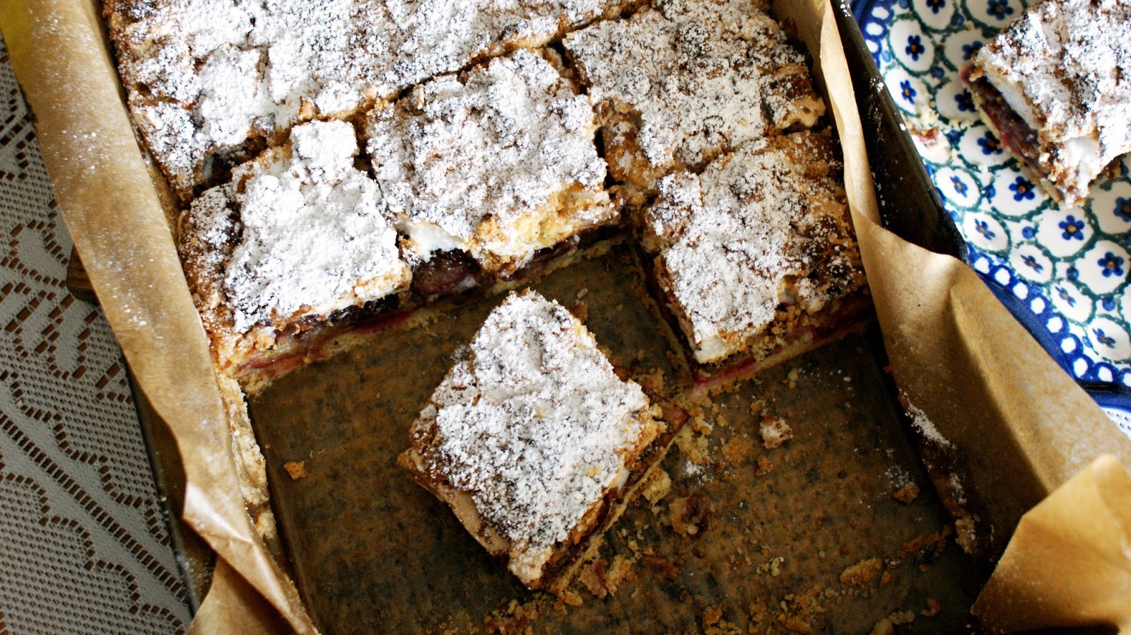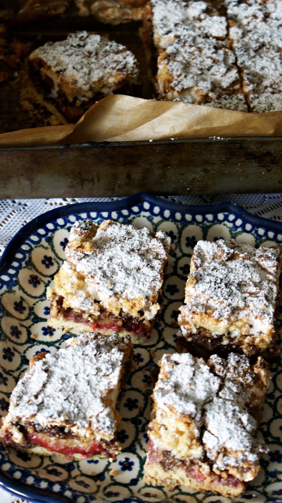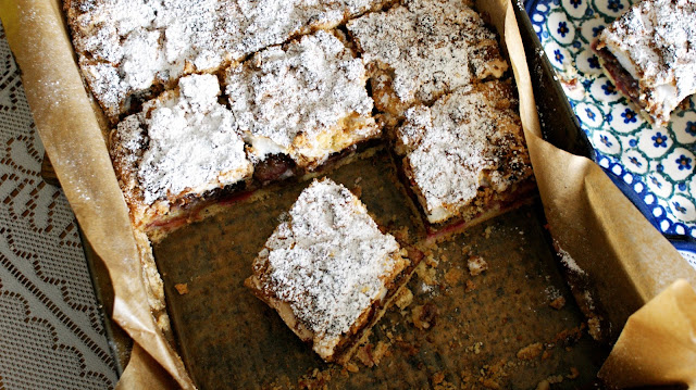 Po ok. 30 minutach wyjąć ciasto z lodówki, duże ciasto wyłożyć do prostokątnej foremki wyłożonej papierem do pieczenia. Wyłożyć przekrojone śliwki, przekrojoną częścią do góry. Na wyłożone owoce, "skubać" kawałki ciasta czekoladowego odrywając po kawałeczku i równomiernie układając. Następnie wylać pianę i również równomiernie rozsmarować. Na wierzch "skubać" białą część ciasta.