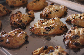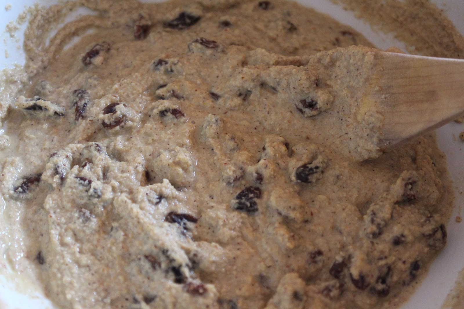 Mieszamy mąkę z jajkami, dodajemy stopniowo wodę z rodzynek, ilość wody regulujemy sami. Ciasto musi osiągnąć konsystencję kremową. Dodajemy rodzynki. Mieszamy dokładnie.