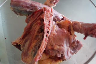 tagliamo a pezzi una meta' , compreso il collo. Leviamo la pelle e la carne.