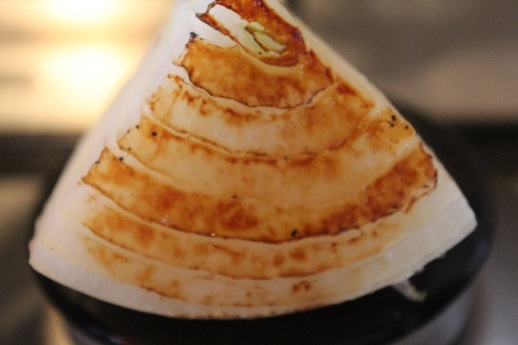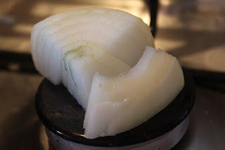 Prendiamo una cipolla e facciamola abbrustolire sul fornello bollente.