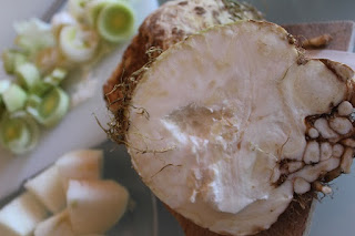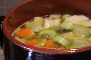 Tagliamo a pezzi le verdure: porro, carote, la meta' del sedano rapa (sbucciata)