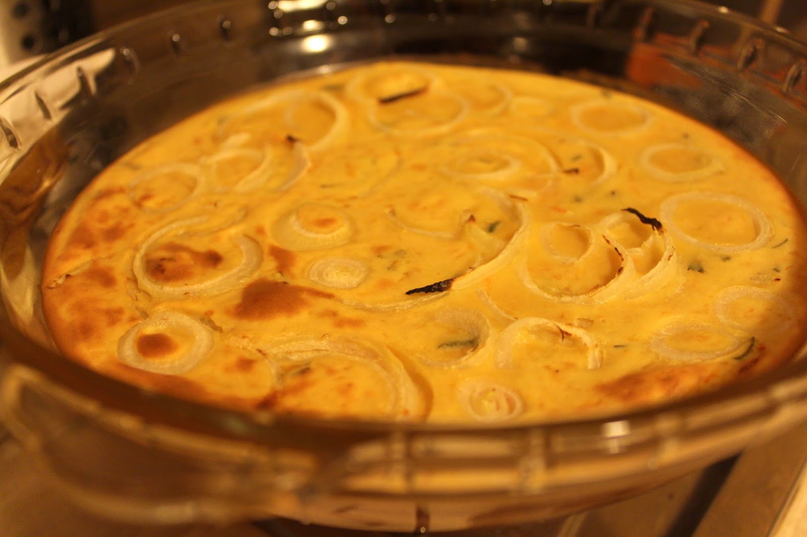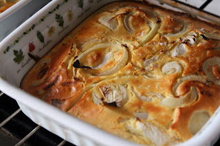 Wlewamy ciasto do naczynia ( wysokość ciasta do kilku milimetrów) posypujemy krążkami pokrojonej cebuli. Doprawiamy pieprzem.