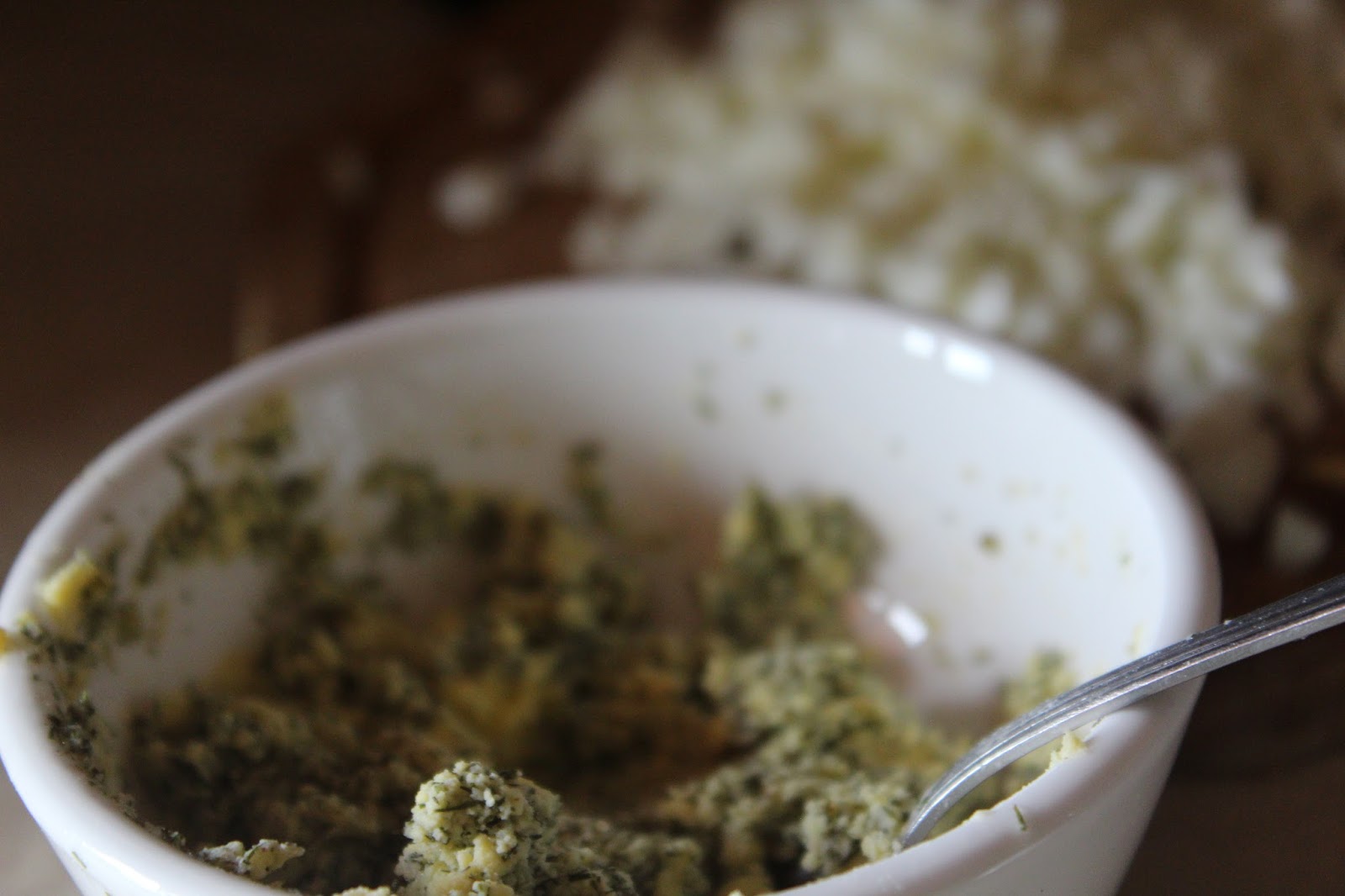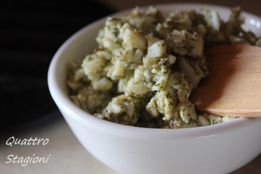 Fate bollire le uova fino a farle diventare sode, sbucciatele, togliete i tuorli d'uovo, amalgamate con aneto e olio.