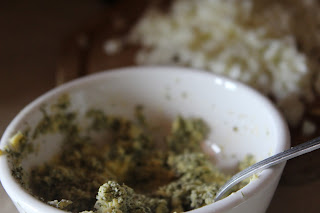 Cebulkę kroimy na drobną kostkę, podsmażamy delikatnie na oleju. Czosnek rozcieramy.