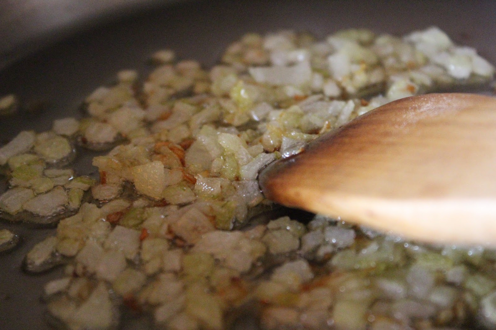 Tagliate la cipolla a cubetti, rosolatela dolcemente sulla padella con olio. Tritate finemente l'aglio.