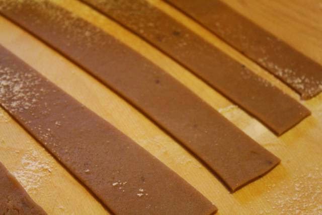 Przykryj ciasto ręcznikiem i pozostawić na 30 minut. Rozwałkować ciasto wałkiem do ciasta i pokroić na cienkie paski, przeplatać paski na różne sposoby.