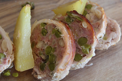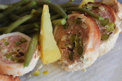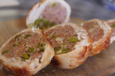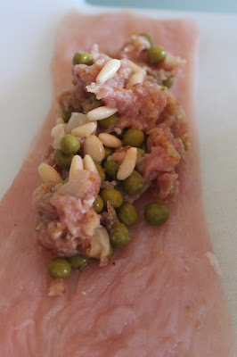 Kładziemy trochę mieszanki mięsa na ubitym plastrze indyka i delikatnie zawijamy, zamykamy plastry wykałaczkami.