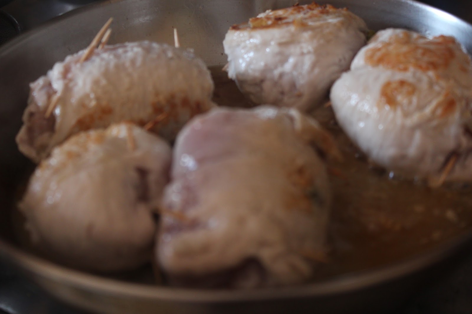 Mettiamo sulla padella un po' di vino bianco, ripassiamo gli involtini in padella da ambo lati.