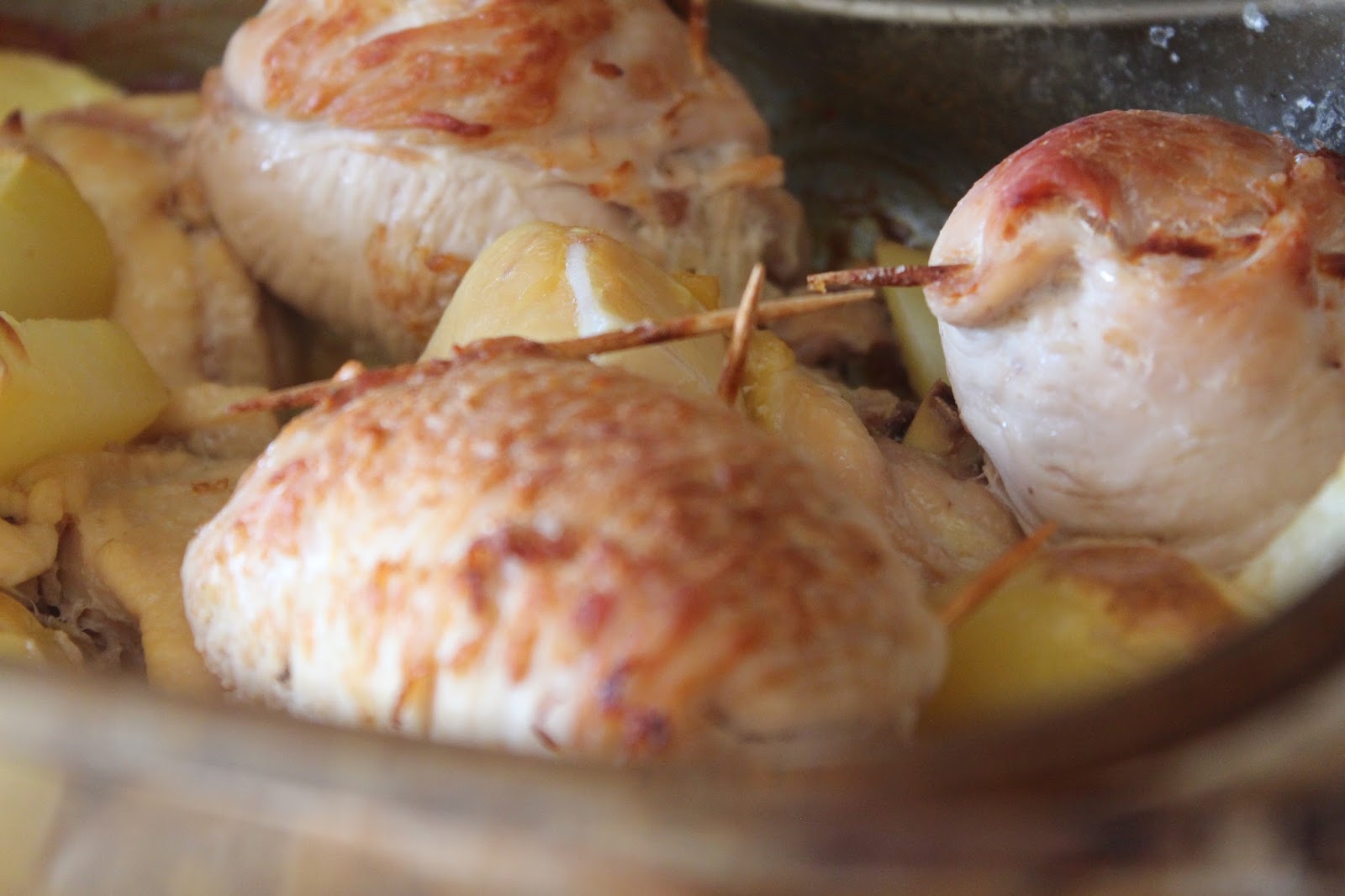 Sistemiamo gli involtini in una pirofila con le patate, aggiungiamo un mestolo di brodo.