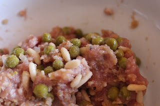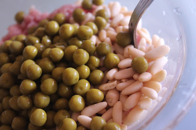 Aggiungiamo al composto i pinoli e pisellini, amalgamiamo tutto.