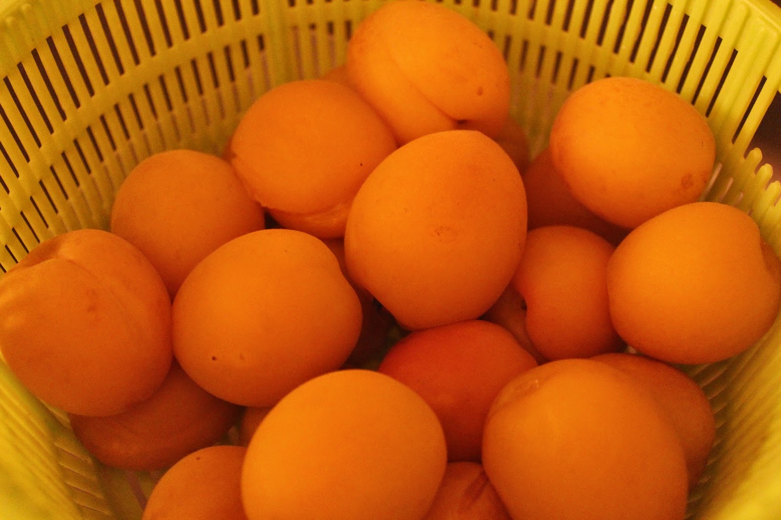 Immergere le albicocche fresche in acqua bollente per un minuto, scolarle bene e lasciarle raffreddare.