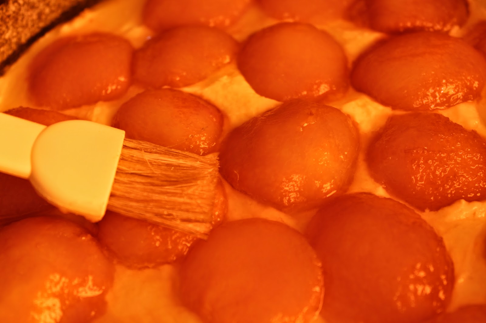 Preparare lo sciroppo con il succo di limone e zucchero, spalmare con lo sciroppo la frutta, grazie a questo le albicocche saranno lucide.