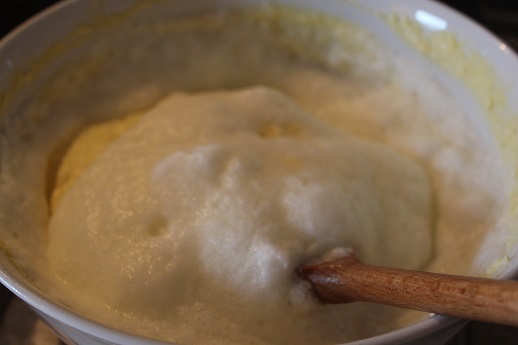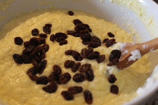 Sbattere la chiara d'uova a neve, aggiungere all'impasto e amalgamare delicatamente con il cucchiaio di legno. Aggiungere l'uvetta.