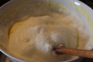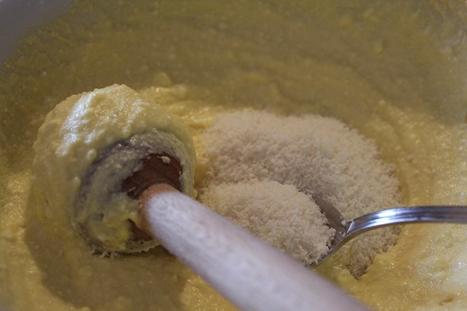 Sciogliere il burro a bagnomaria, raffreddarlo. Aggiungerlo al composto di ricotta, aggiungere la farina di cocco. Amalgamare tutto.
