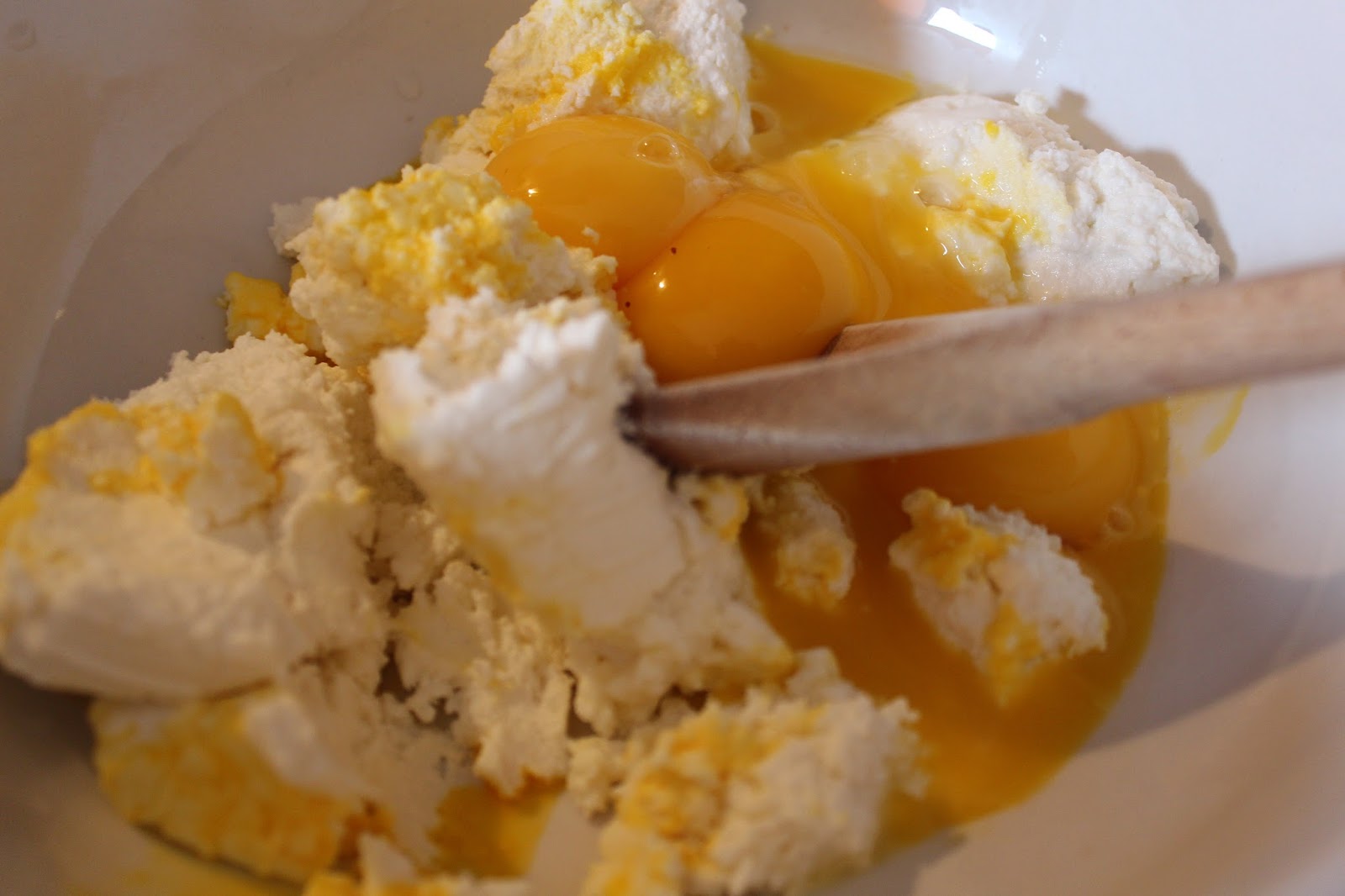 Amalgamare la ricotta con i tuorli e stevia. Mettere l'uvetta a bagno nell'acqua bollente, finche' diventi gonfia.