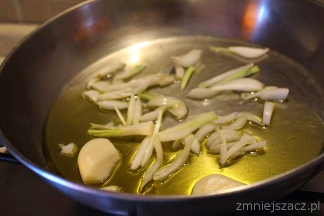 Lekko podsmażyć cebulę na oleju z oliwek dodać świeży czosnek przecięty na pół .