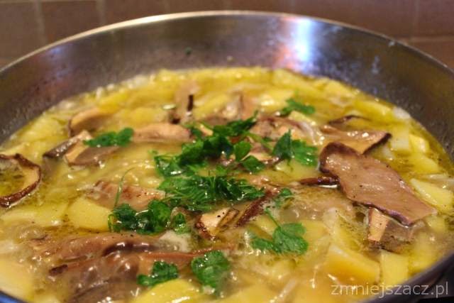Dodać grzyby wcześniej namoczone w gorącej wodzie. Umyte pod bieżącą wodą.