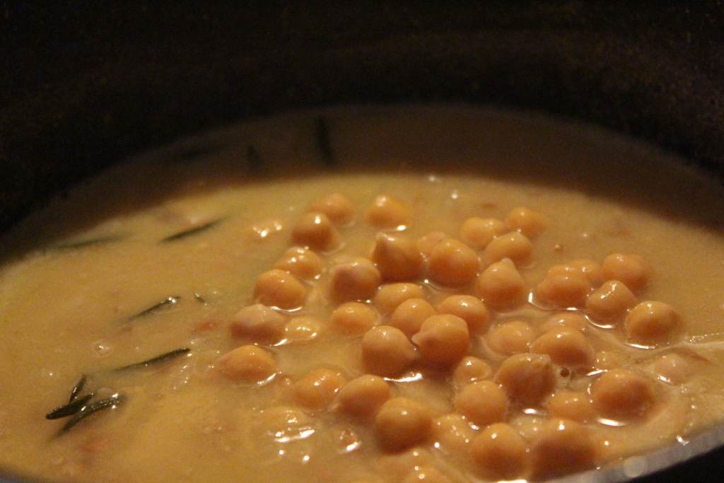 Otrzymany krem dodać do podsmażonej cebulki i czosnku. Doprowadzić do wrzenia, dodać rozmaryn, ciecierzycę (wcześniej odłożoną) i dwa listki szałwi.
