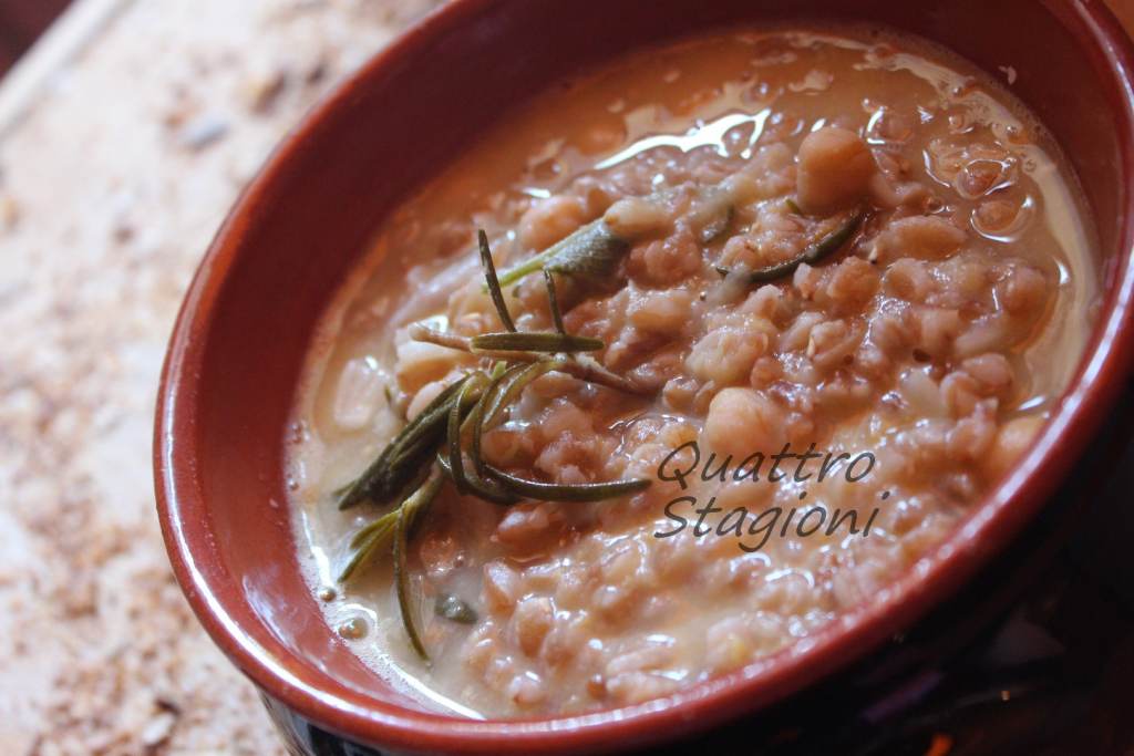 Unite la crema di ceci al soffritto. Portate ad ebollizione e aggiungete il farro, il rosmarino, i ceci interi e due foglie di salvia fresca.