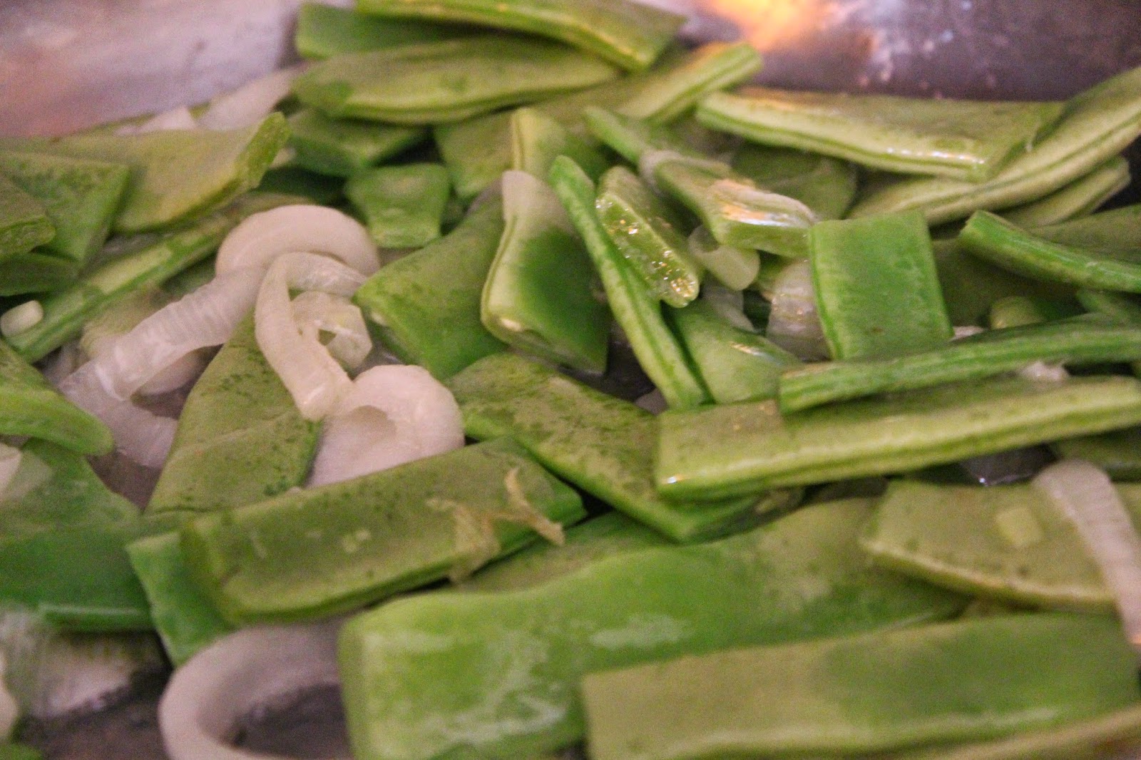 Myjemy 'taccole' i odcinamy końcówki, sprawdzamy czy fasola nie posiada 'nitek', jeśli tak... odrywamy je. Kroimy każdą sztukę na trzy, cztery kawałki. Dodajemy fasolkę do cebuli smażymy przez kilka minut ciągle mieszając, dodajemy ciepły rosół, gotujemy pod przykryciem przez 30 minut (na wolnym ogniu).