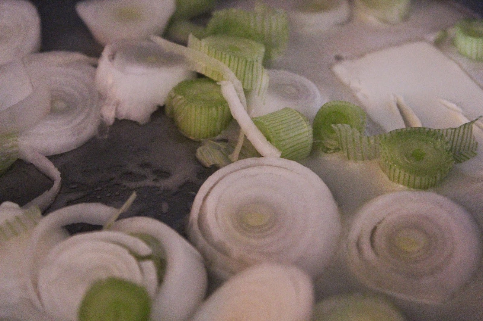 Myjemy i kroimy cebulki w krążki, podsmażamy na maśle, nie do zrumienienia.