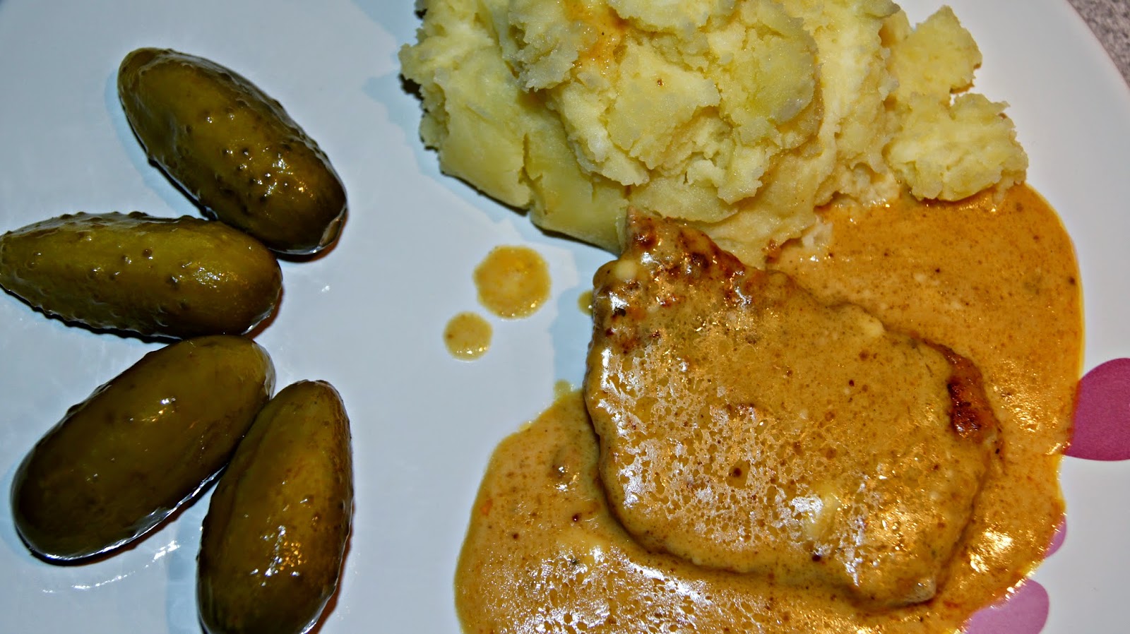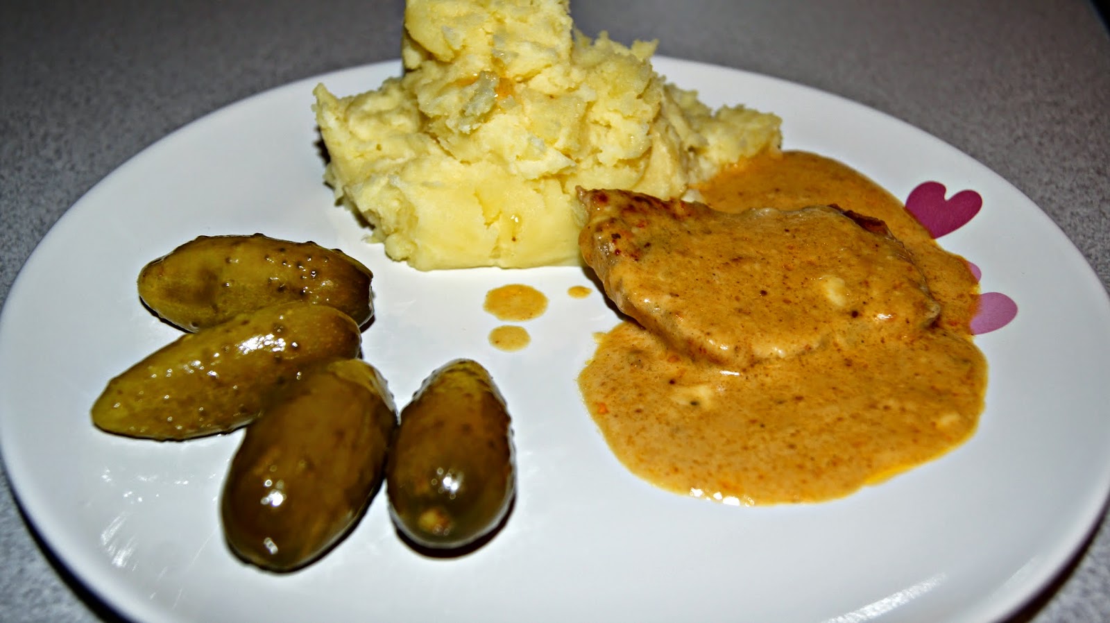 Tak powstałe mięso w sosie podałam z ziemniakami ubitymi z łyżką śmietany 18% i ogórkami konserwowymi. Nam ten obiad bardzo smakował, na pewno go powtórzymy! :)
