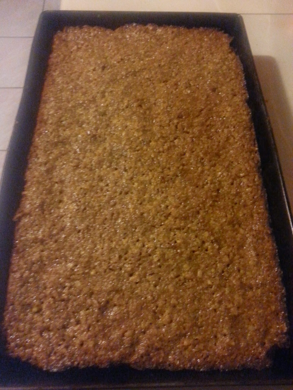 Masę grysikową położyć na pierwsze ciasto i przykryć drugim z masą orzechową, odstawiamy do chłodnego miejsca na jakiś czas.