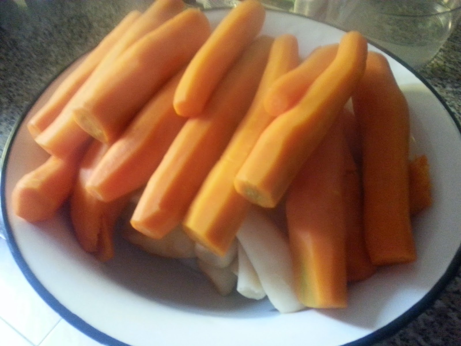 Ilość marchewki i pietruszki powinna być taka sama, w zależności od tego ile sałatki chcemy zrobić. Gotujemy marchewkę, następnie pietruszkę i seler. Zostawiamy je do ostygnięcia. Jak to się stanie, kroimy jarzynki, ja mam takie specjalne siteczko, którym zawsze potne palce.