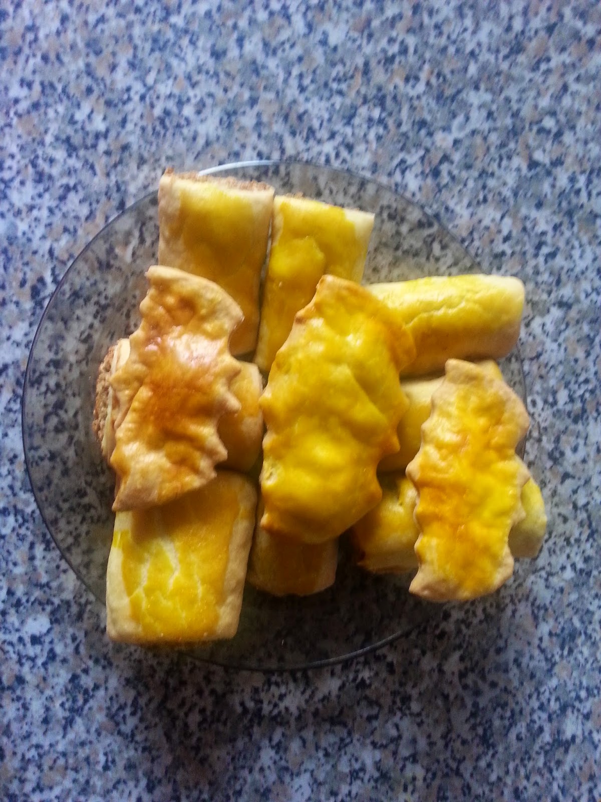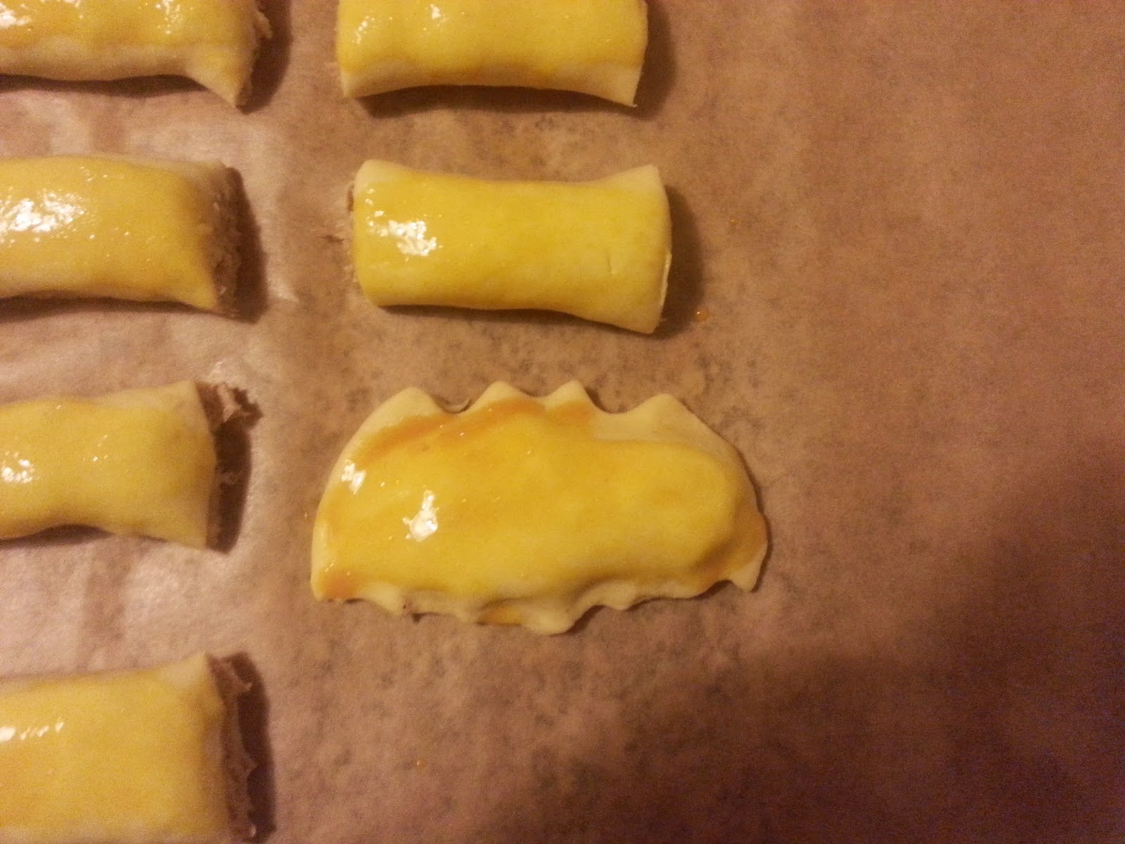Ciasto dzielimy na części i rozwałkujemy. farsz układamy na szerokość farszu w kształcie rulonika, zawijamy ciasto a nadmiar odcinamy. Rulonik kroimy na małe paszteciki, smarujemy rozbełtanym żółtkiem i układamy na blaszkę wyłożoną papierem do pieczenia. Pieczemy w 180 stopniach.