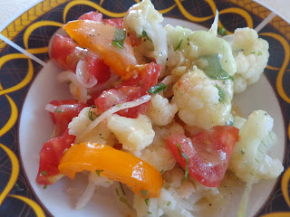 1/2 kalafior 1 pomidor1 papryka1 cebulaczosnekolejmusztarda dijonmiódcytrynapieprzsólPrzygotowanie:Kalafior ugotować na al' dente i podzielić na małe różyczki. Pomidor pokroić w kostkę, paprykę w kostkę. Cebulę w półksiężyce cieniutko i porozdzielać.